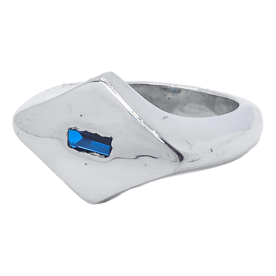 Elevate your jewellery collection with the Diamond Blue Gemstone Ring, a bold, handcrafted piece that fuses clean geometry with vibrant elegance. Made from 100% recycled 925 sterling silver, this striking design features a horizontal diamond-shaped silhouette with a rectangular cutout and a brilliant blue spinel gemstone at its heart.