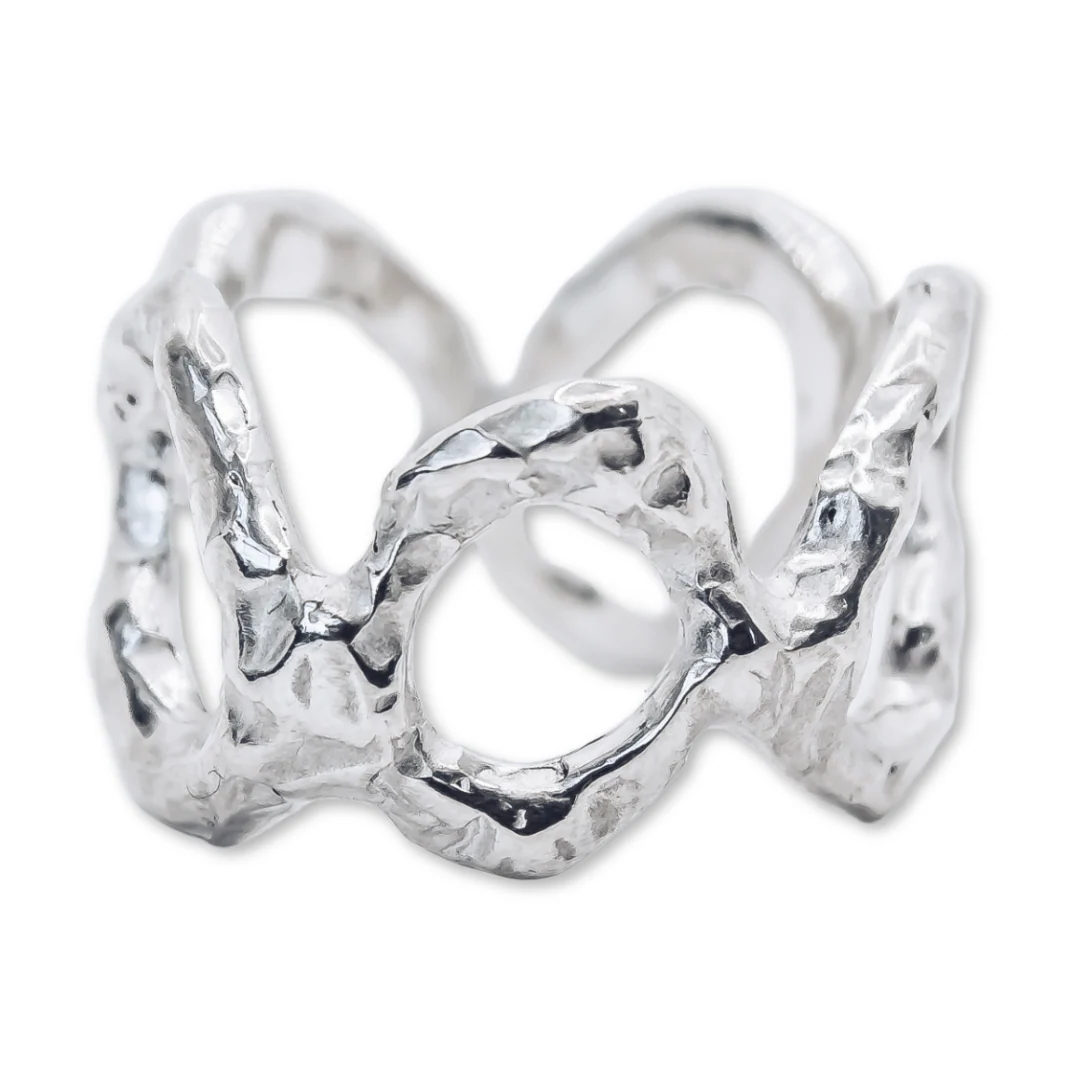Meet your new go-to statement piece: the Organic Sculptural Silver Ring, handcrafted from scratch using the ancient lost wax carving technique. This unique open-form ring is carved in wax by hand, capturing a raw and fluid texture that celebrates natural imperfection. Each piece is then cast in solid, recycled 925 sterling silver right in our London studio.