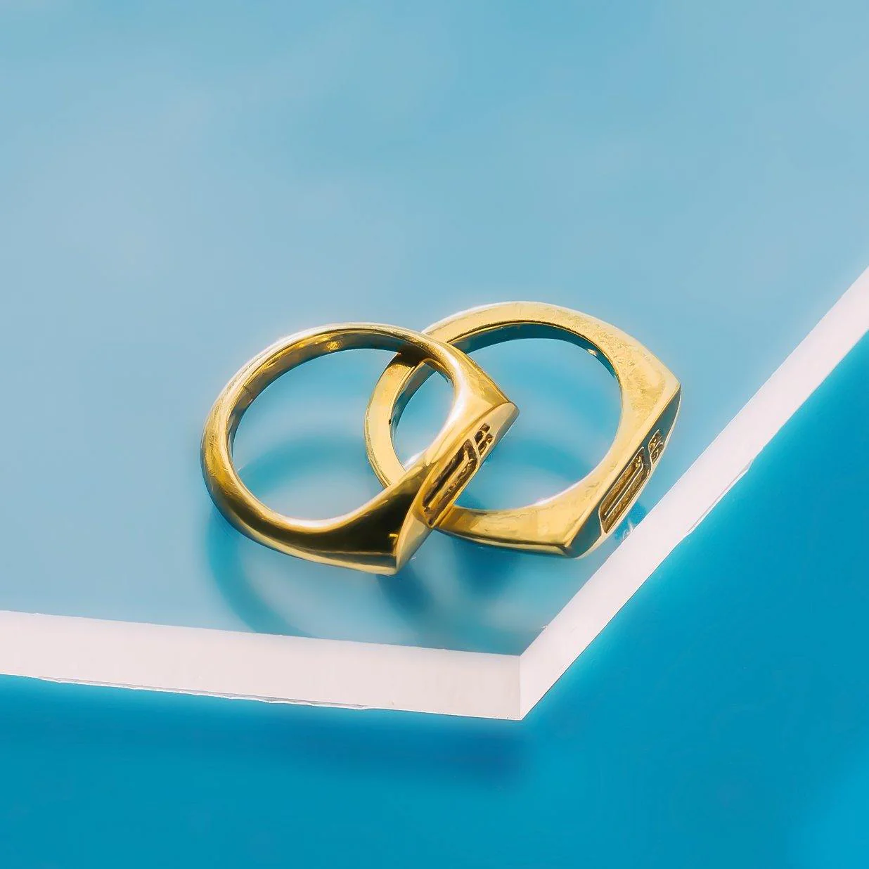 Each ring is handcrafted in London from solid materials and finished in radiant 22ct gold plating. The set is also available in 925 Sterling Silver for a timeless, versatile alternative. The sleek mirror-polished surface catches light beautifully, while the minimalist silhouette adds an edge of sophistication.